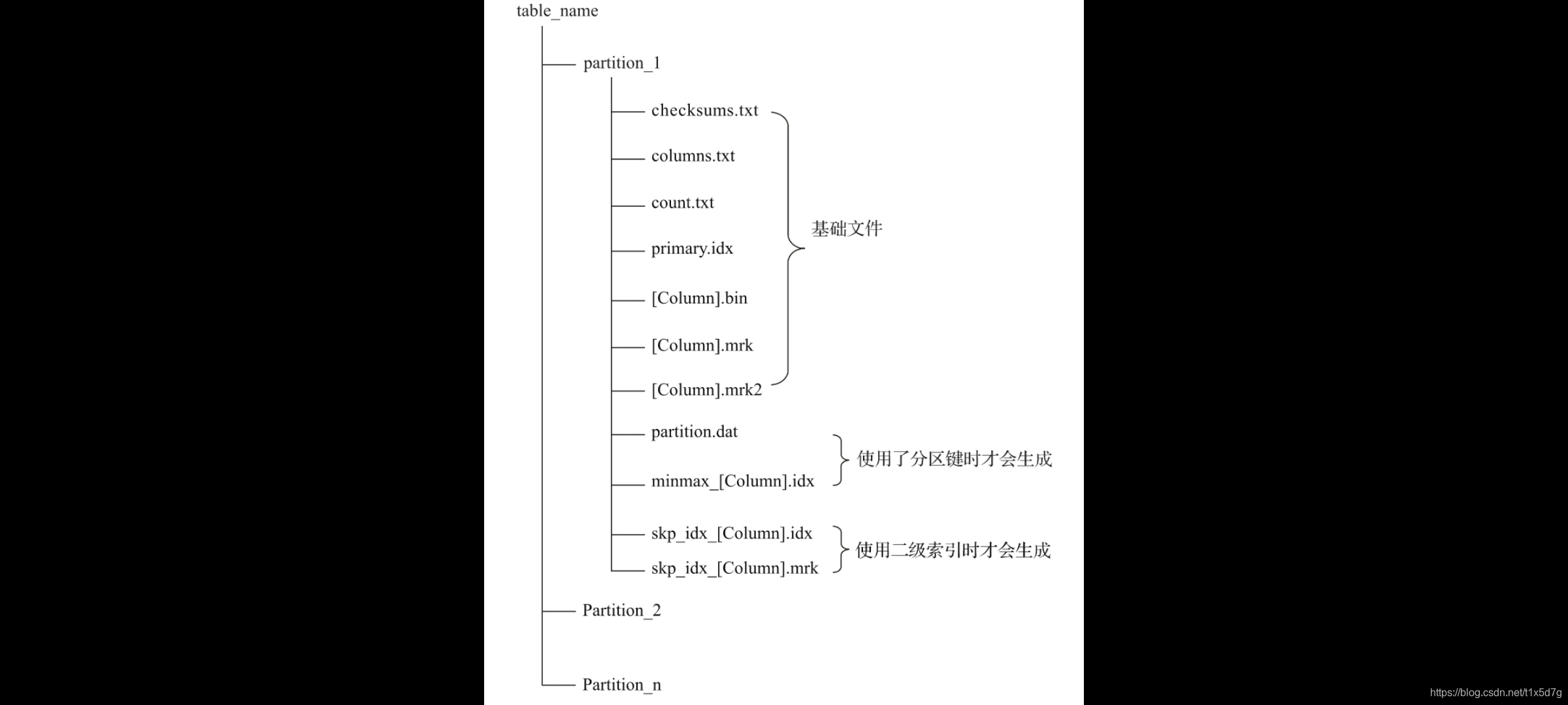 checksums.txt:校验文件,用于快速校验文件的完整性和正确性columns.txt:列信息文件,保存分区列字段信息count.txt:计数文件,当前数据分区目录下数据的总行数primary.idx:一级索引文件[Column].bin:数据文件,使用压缩格式存储,默认为LZ4压缩格式,用于存储某一列的数[Column].mrk:列字段标记文件,保存了.bin文件中数据的偏移量信息[Column].mrk2:使用了自适应大小的索引间隔,则标记文件会以.mrk2命名partition.dat与minmax_[Column].idx:如果使用了分区键,例如PARTITION BY EventTime,则会额外生成partition.dat与minmax索引文件,partition.dat用于保存当前分区下分区表达式最终生成的值;而minmax索引用于记录当前分区下分区字段对应原始数据的最小和最大值。例如EventTime字段对应的原始数据为2019-05-01、2019-05-05,分区表达式为PARTITION BY toYYYYMM(EventTime)。partition.dat中保存的值将会是2019-05,而minmax索引中保存的值将会是2019-05-012019-05-05数据查询时能够快速跳过不必要的数据分区目录,减少最终需要扫描的数据范围skp_idx_[Column].idx与skp_idx_[Column].mrk:如果在建表语句中声明了二级索引,则会额外生成相应的二级索引与标记文件
