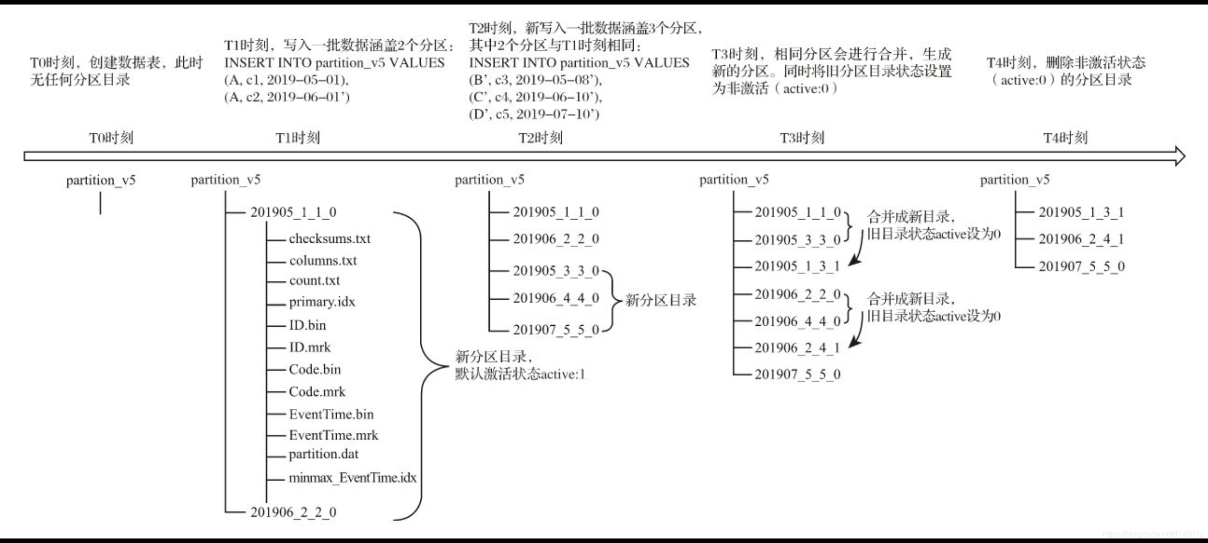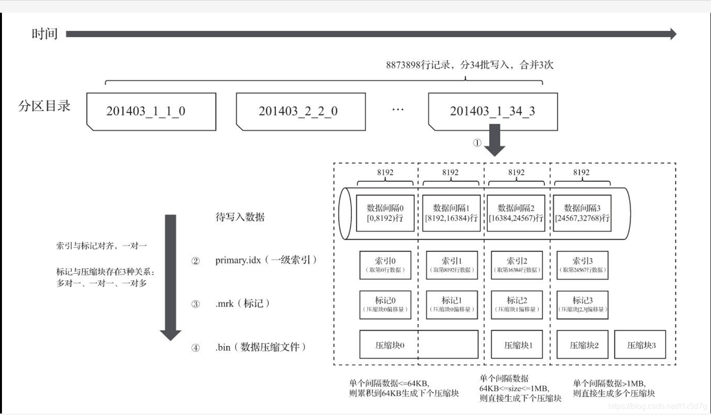 1 生成分区目录 2 新数据写入,生成新的分区目录 3 相同分区的目录会依照规则合并 4 生成primary.idx一级索引(如果声明了二级索引,还会创建二级索引文件) 5 每一个列字段的.mrk数据标记和.bin压缩数据文件