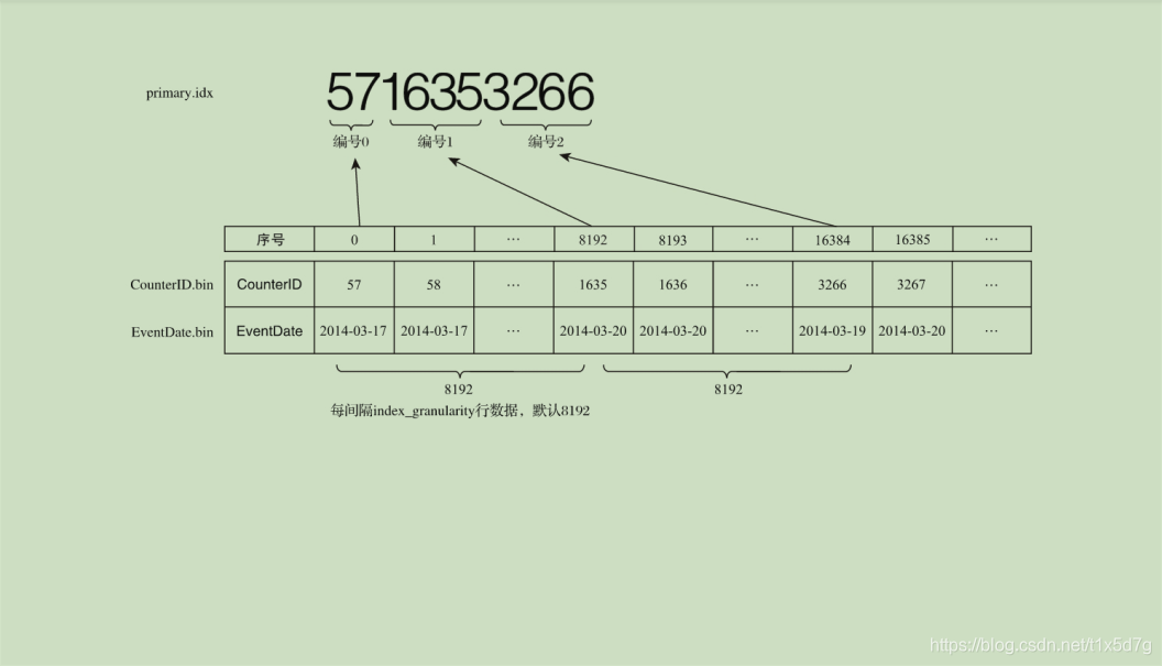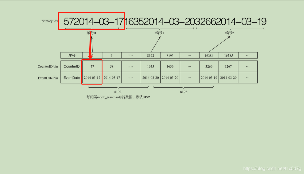 可以看下图理解 例如第0(8192*0)行CounterID取值57,第8192(8192*1)行CounterID取值1635,而第 16384(8192*2)行CounterID取值3266,最终索引数据将会是5716353266