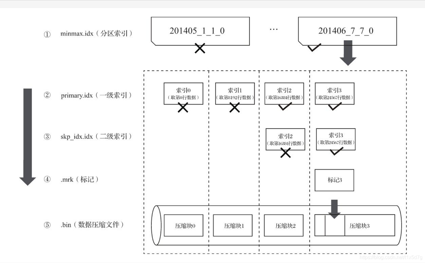 INDEX index_name expr TYPE index_type(...) GRANULARITY granularity 2 跳数索引会额外生成相应的索引与标记文件(skp_idx_[Column].idx与skp_idx_[Column].mrk)1 对于跳数索引而言,index_granularity定义了数据的粒度,而granularity定义了聚合信息汇总的粒度。换言之,granularity定义了一行跳数索引能够跳过多少个index_granularity区间的数据。