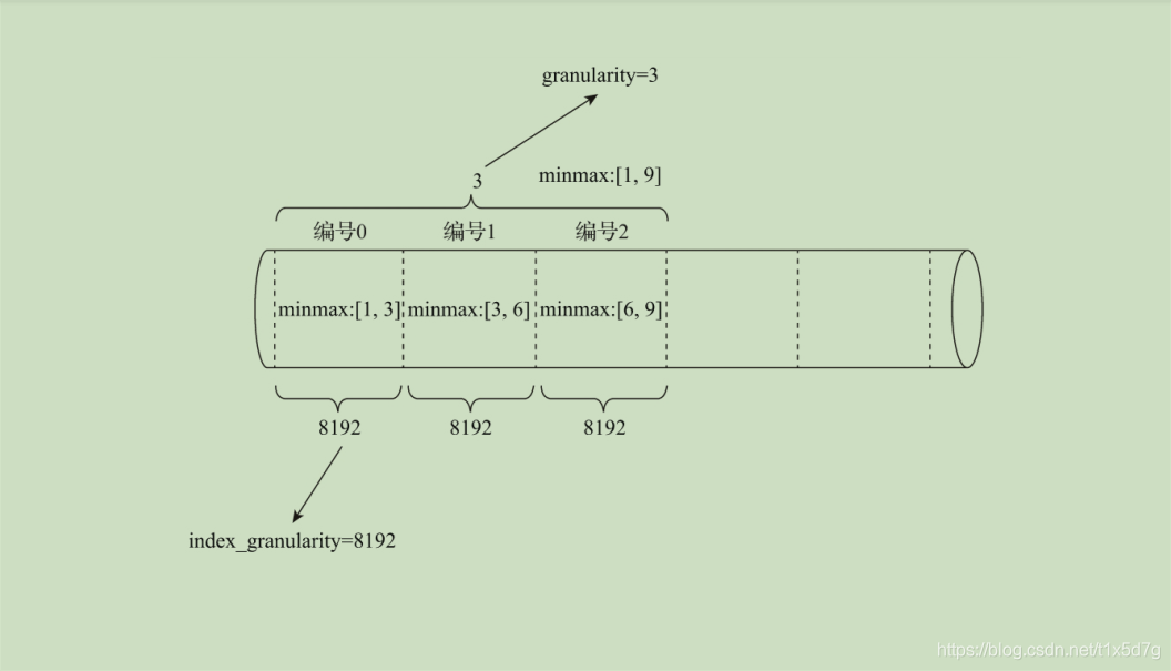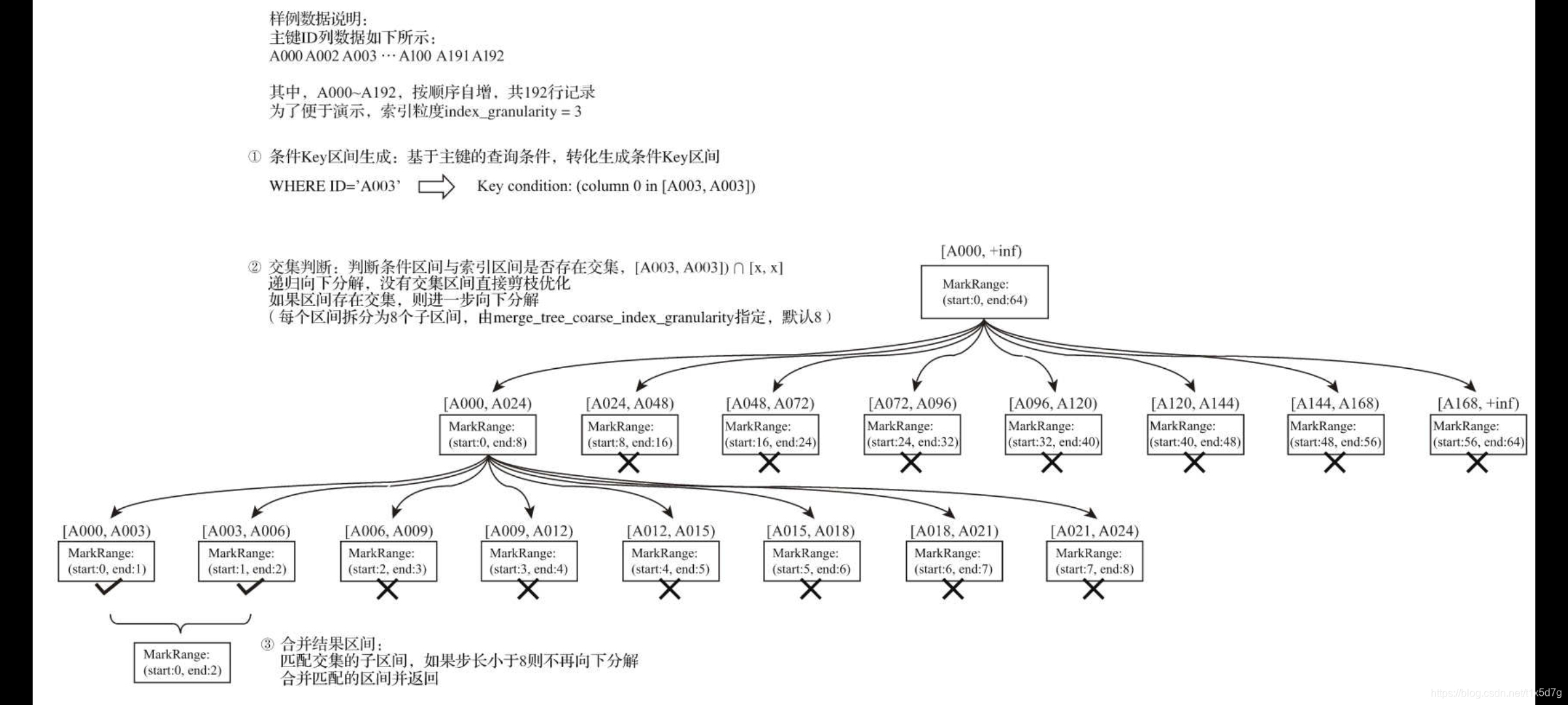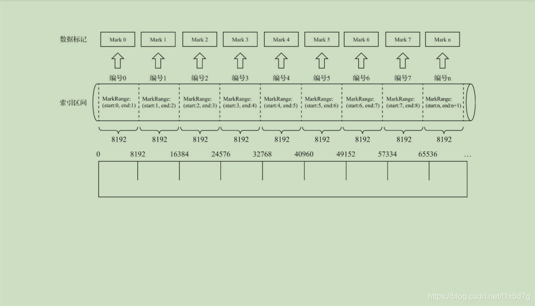 对于数据标记而言,它记录了两点重要信息: 其一,是一级章节对应的页码信息; 其二,是一段文字在某一页中的起始位置信息。 这样一来,通过数据标记就能够很快地从一本书中立即翻到关注内容所在的那一页,并知道从第几行开始阅读。 数据标记特征 数据标记和索引区间是对齐的,均按照index_granularity的粒度间隔。通过索引区间的下标编号就可以直接找到对应的数据标记。 见下图